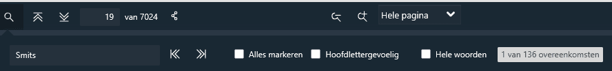 Zoeken zal waarschijnlijk het meest voorkomen. Als u klikt op het vergrootglas krijgt u een zoekveld. In het voorbeeld heb ik Smits ingetypt. Het bestand is tamelijk groot zodat het zoeken even duurt. U ziet dat doordat rechts het aantal treffers stijgt. Na even wachten ziet u dat er 136 treffers zijn met die naam. Natuurlijk wordt dat aantal kleiner als u Smits wijzigt in Smitsz. Dan zijn het er opeens nog maar 17.